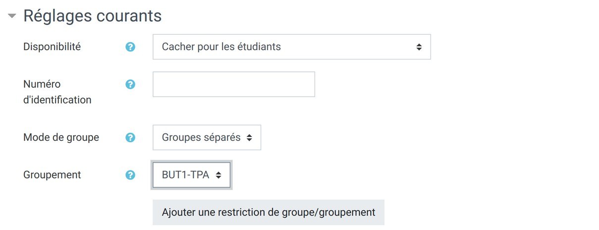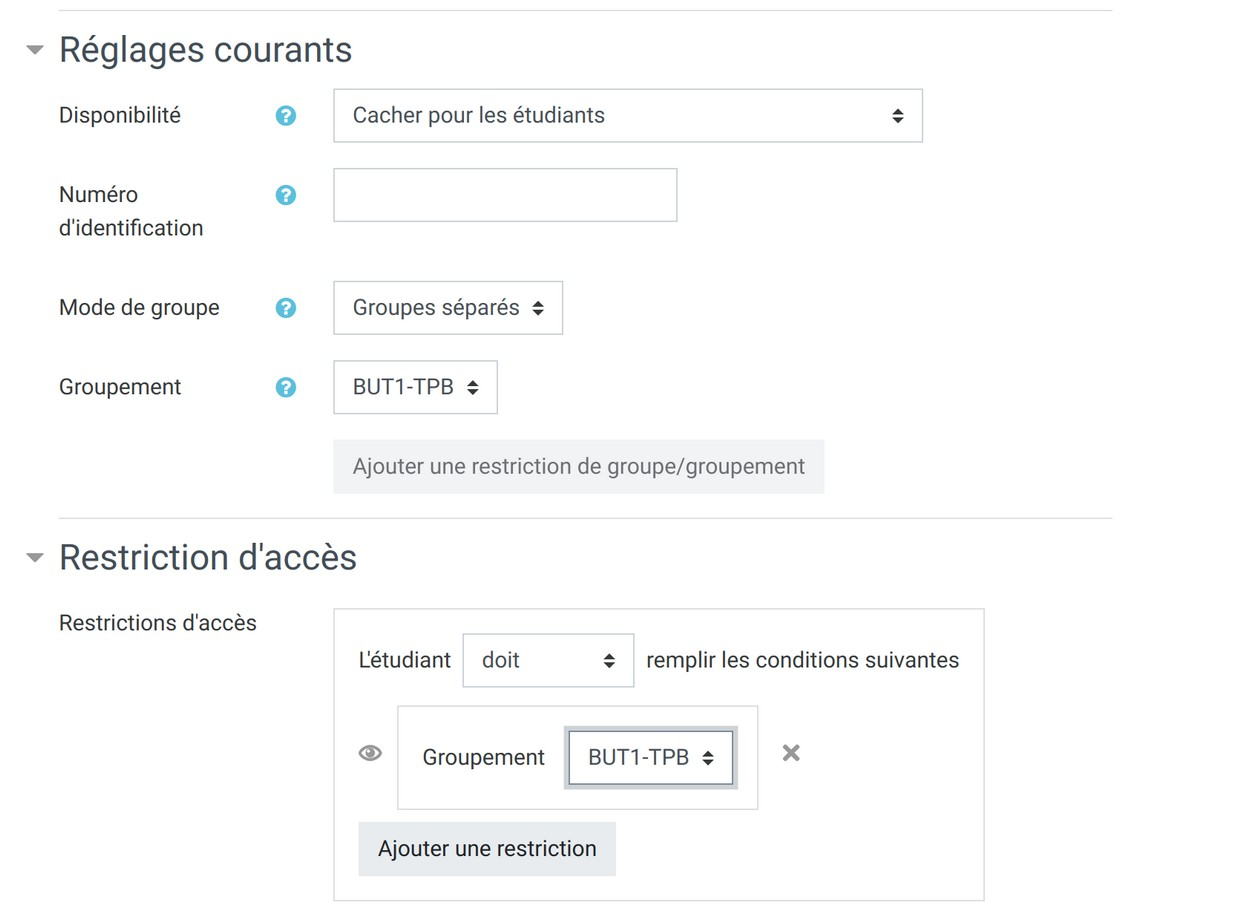 - Une fois les réglages choisis, choisissez "Groupes séparés" comme mode de groupe puis "Ajouter une restriction de groupe/groupement"