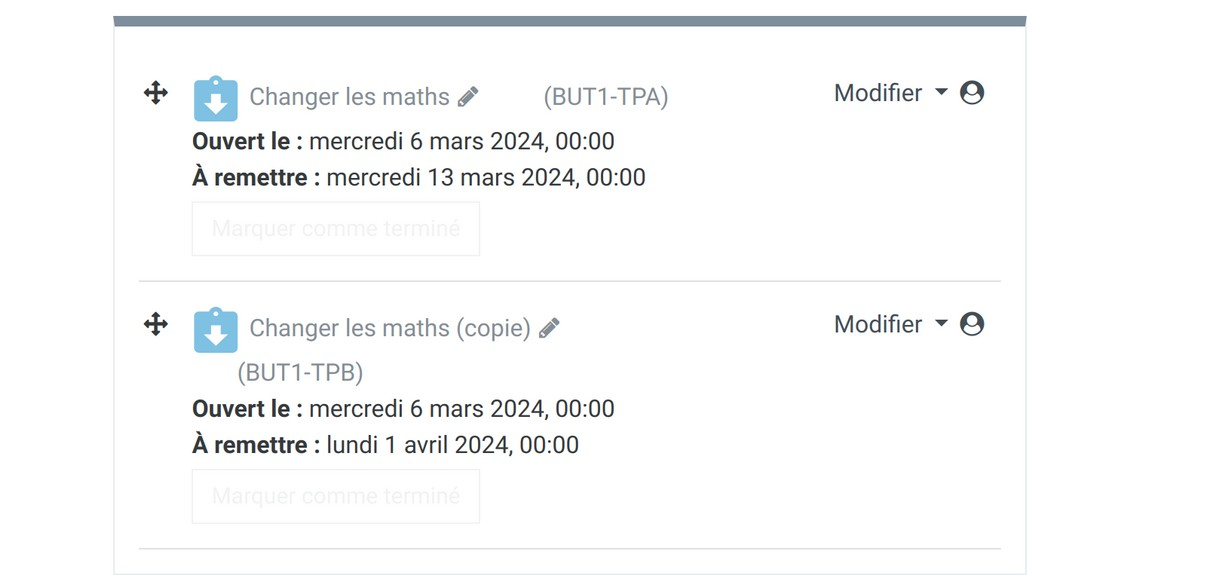 - Lorsque vous retournez au cours, vous pouvez maintenant dupliquer votre boite de dépôt et changer ensuite le groupe concerné pour modifier les dates de restitution.