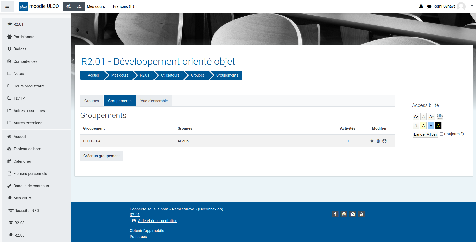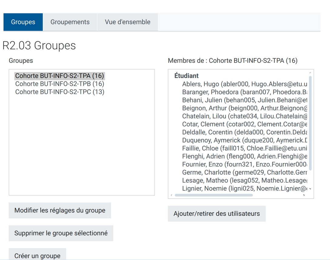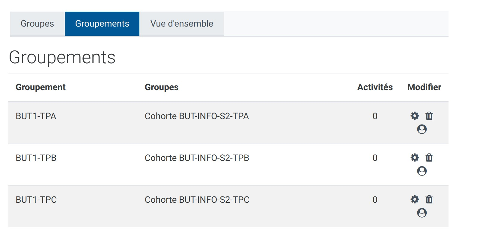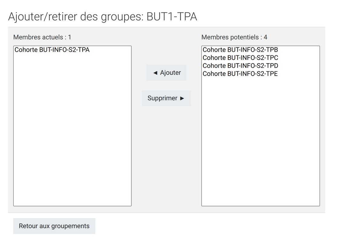 - En suivant la même logique, on peut aussi créer des groupes TD en réunissant plusieurs TP dans un groupement.
