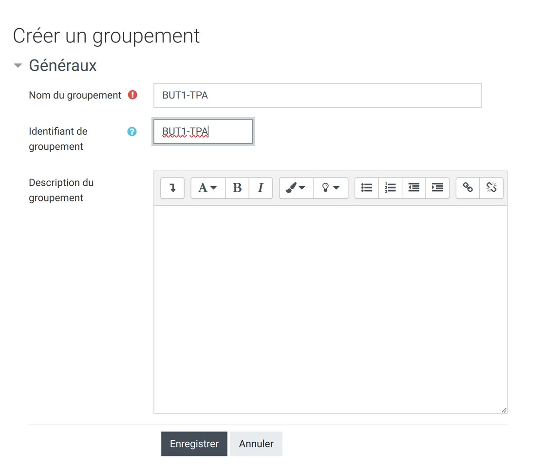 - Attention ! Lorsqu'on souhaite simplement avoir une boite de dépôt par TP, il faut créer autant de groupements que de groupes TP. Pour cela, on ajoute chaque groupe TP à un nouveau groupement.