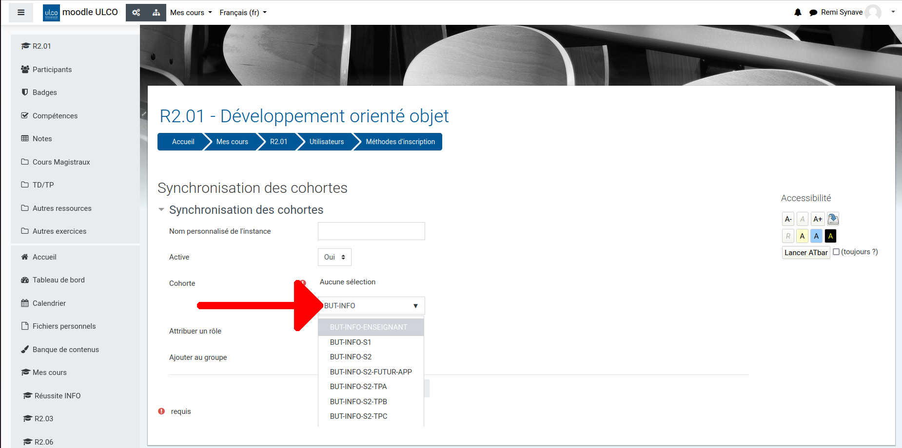 - Vous pourrez retrouver toutes les cohortes de BUT Informatique en tapant "BUT-INFO" dans la case "Cohorte". Sélectionnez la cohorte à inscrire.