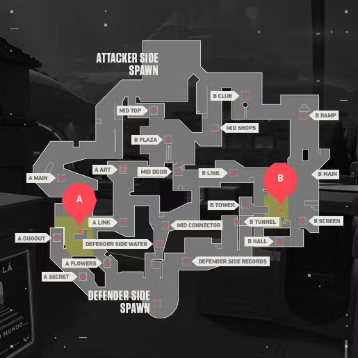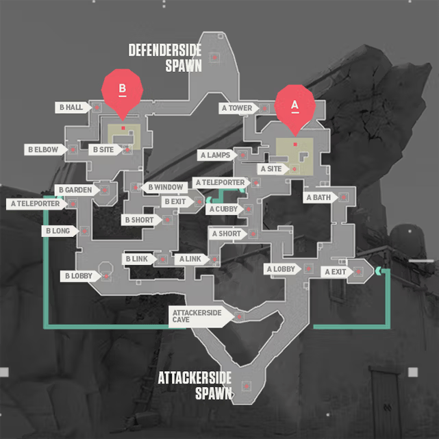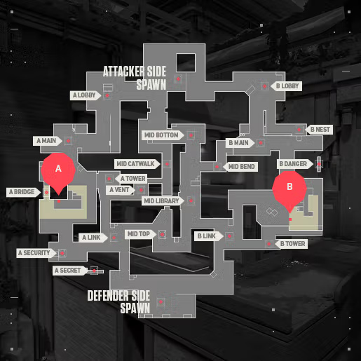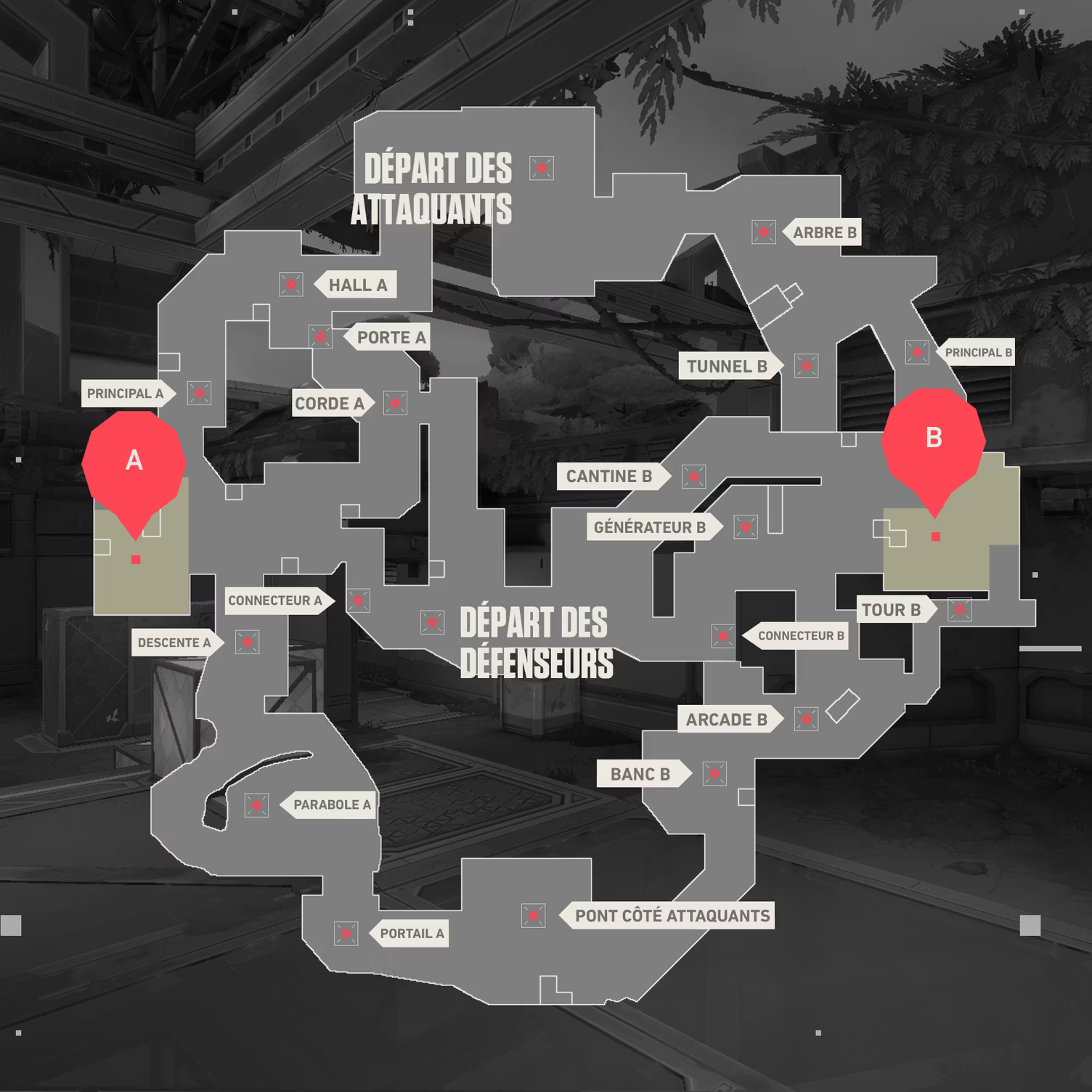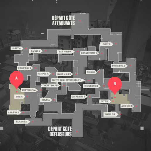 Une carte à deux sites sans zone centrale. Vous devez choisir d'aller à gauche ou à droite. Elle est unique grâce à ses téléporteurs qui permettent de changer rapidement de site ou de contourner l'ennemi.