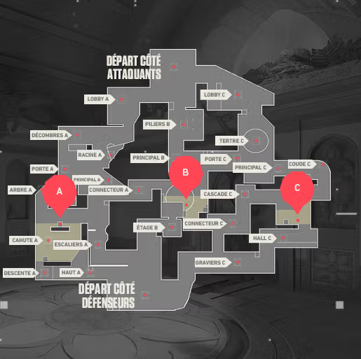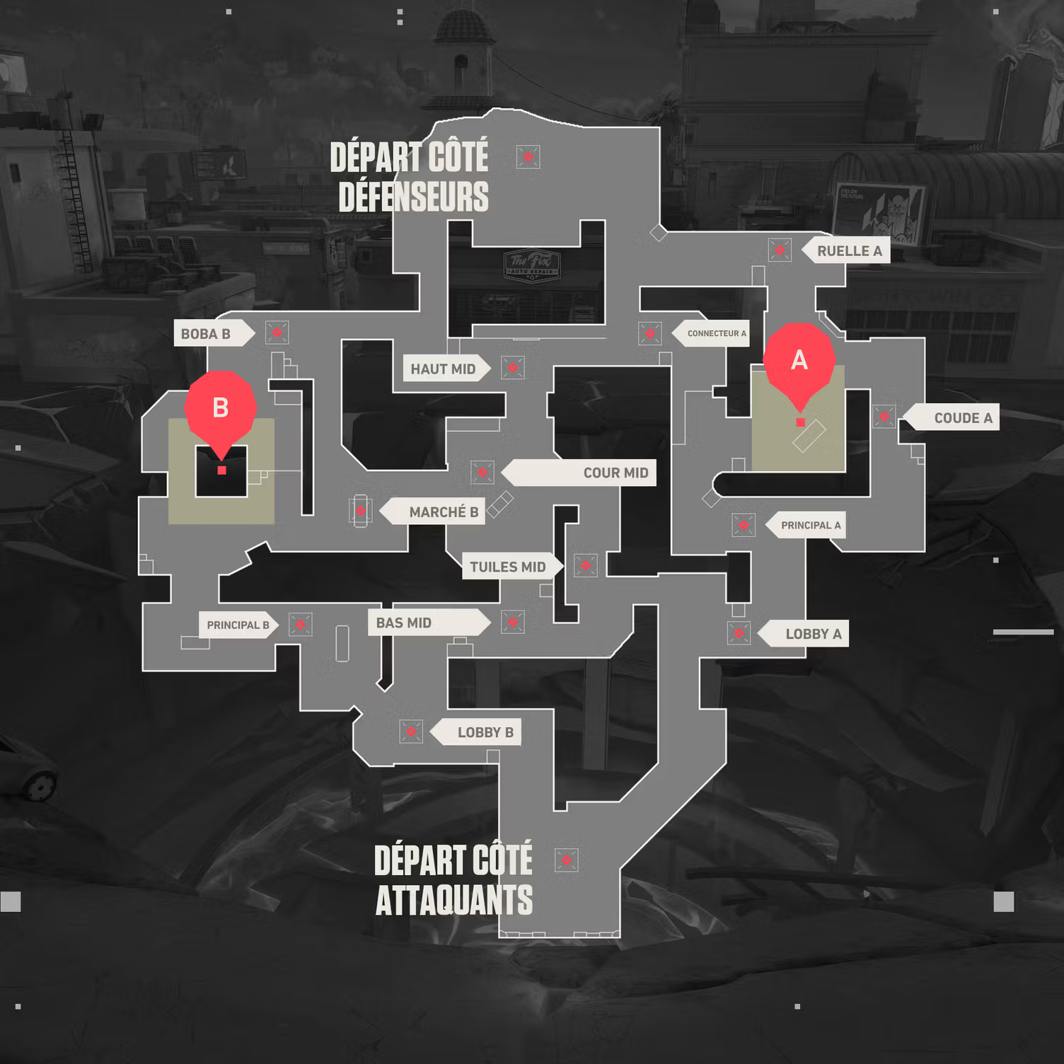 Ancien château français transformé en mine de sel de Radianite. C'est une carte classique à trois voies, avec des combats dans les rues médiévales et autour de l'équipement minier.